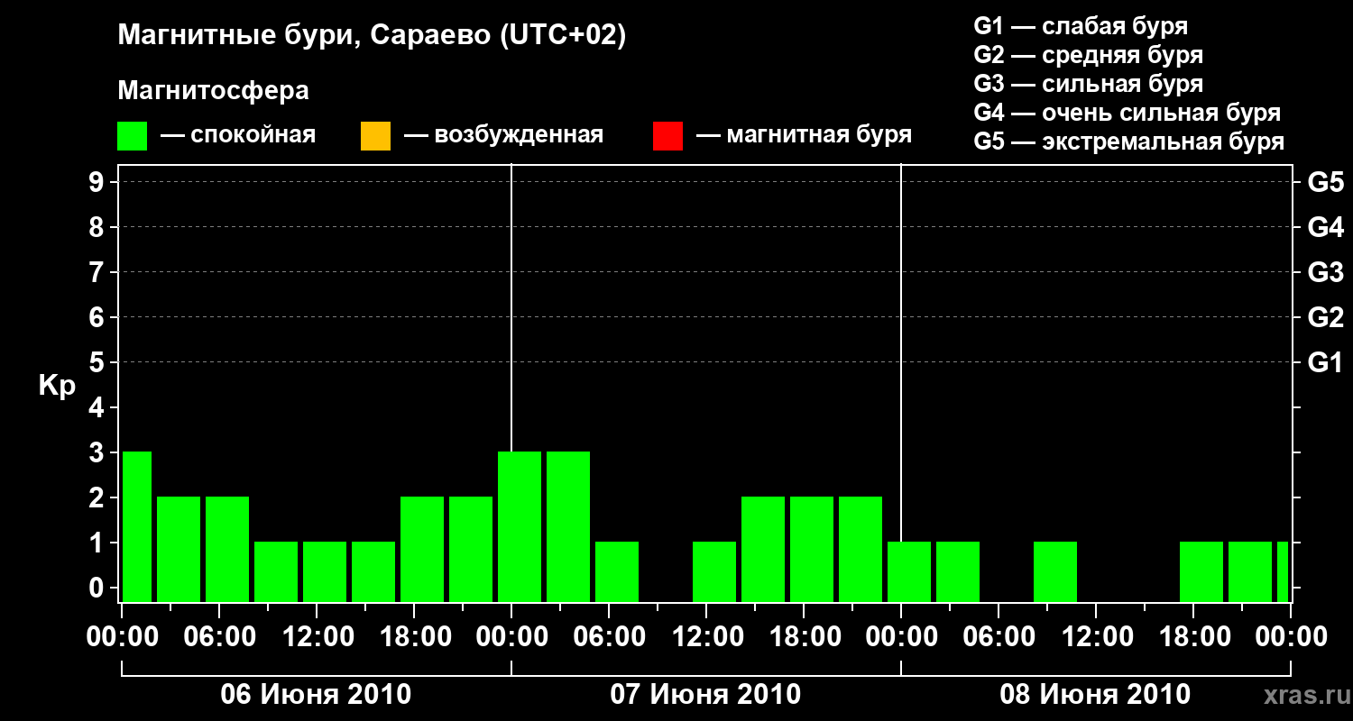 Изменения геомагнитного индекса Kp с 6 по 8 июня 2010 года для средних широт