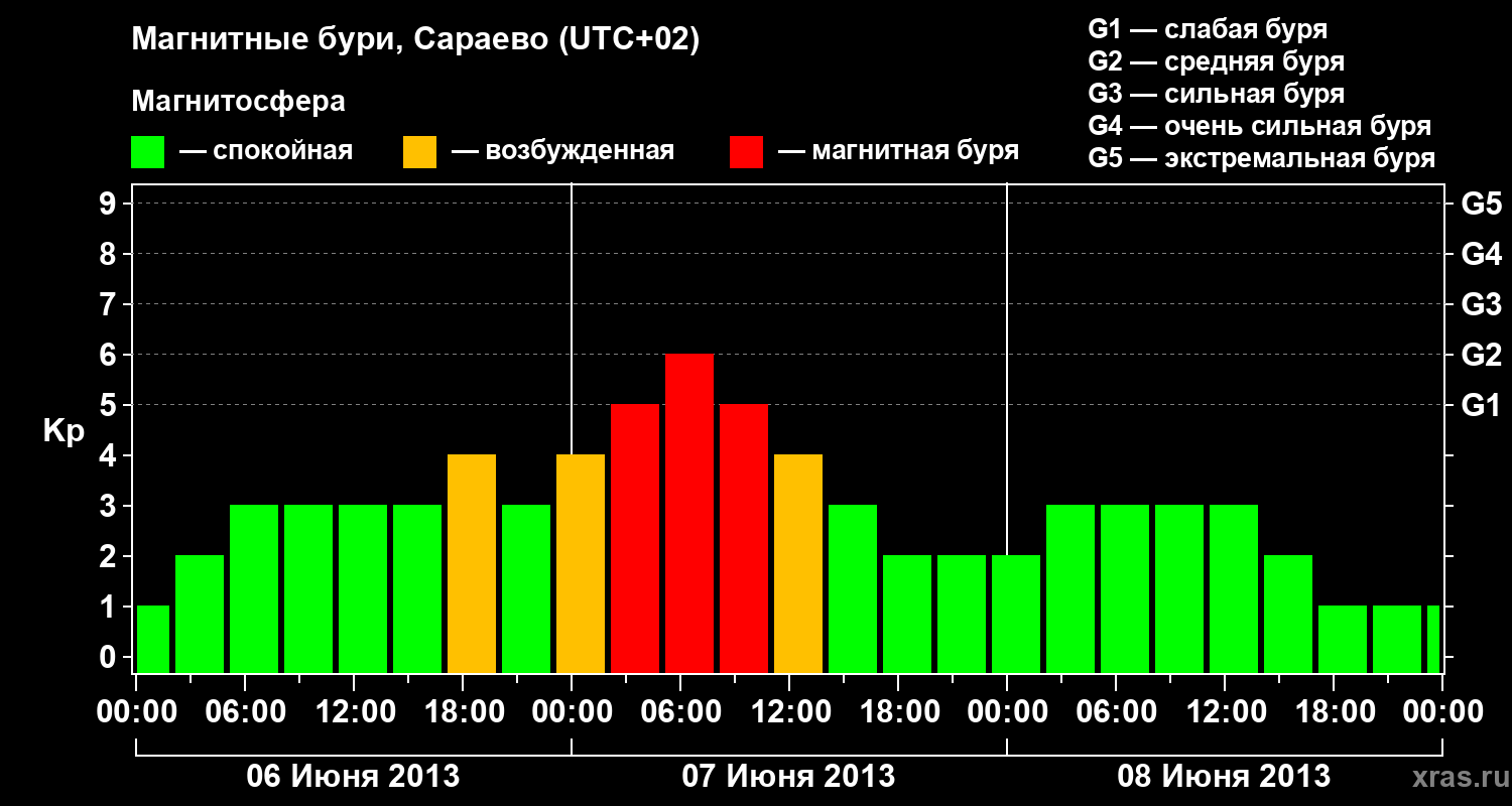 Изменения геомагнитного индекса Kp с 6 по 8 июня 2013 года для средних широт
