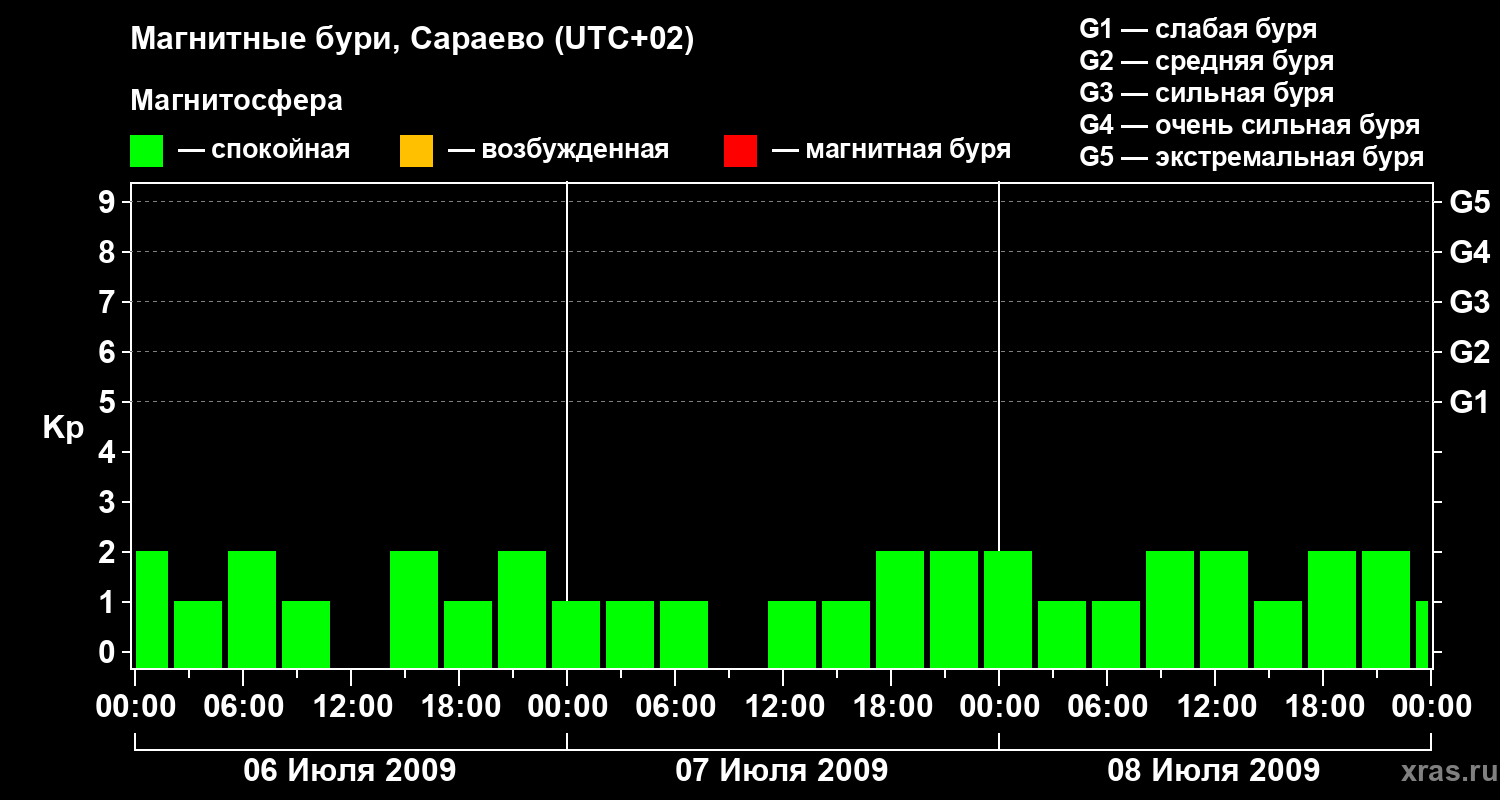 Изменения геомагнитного индекса Kp с 6 по 8 июля 2009 года для средних широт
