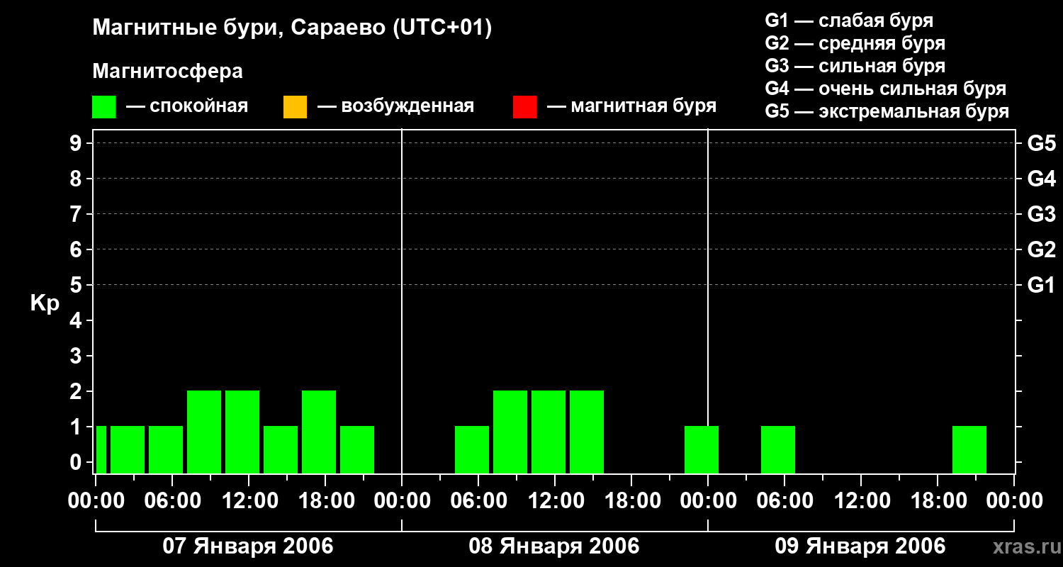 Изменения геомагнитного индекса Kp с 7 по 9 января 2006 года для средних широт