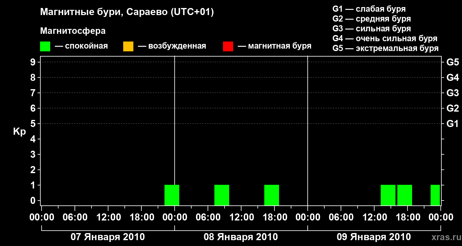 Изменения геомагнитного индекса Kp с 7 по 9 января 2010 года для средних широт