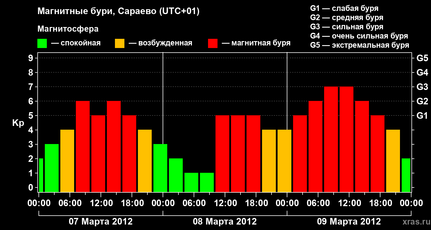 Изменения геомагнитного индекса Kp с 7 по 9 марта 2012 года для средних широт