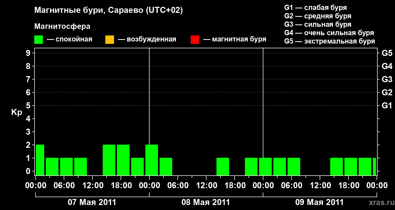 Изменения геомагнитного индекса Kp с 7 по 9 мая 2011 года для средних широт