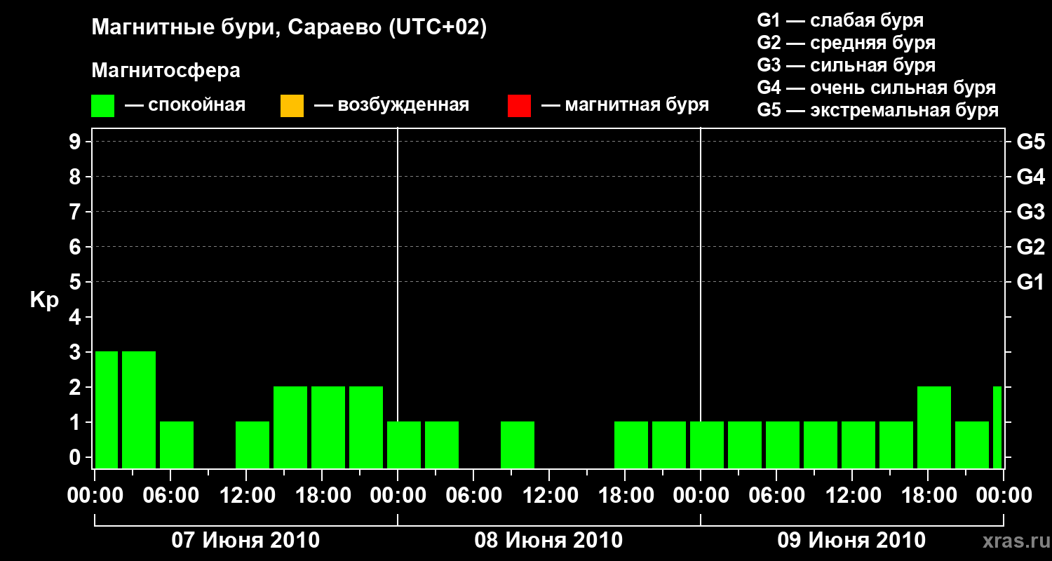 Изменения геомагнитного индекса Kp с 7 по 9 июня 2010 года для средних широт