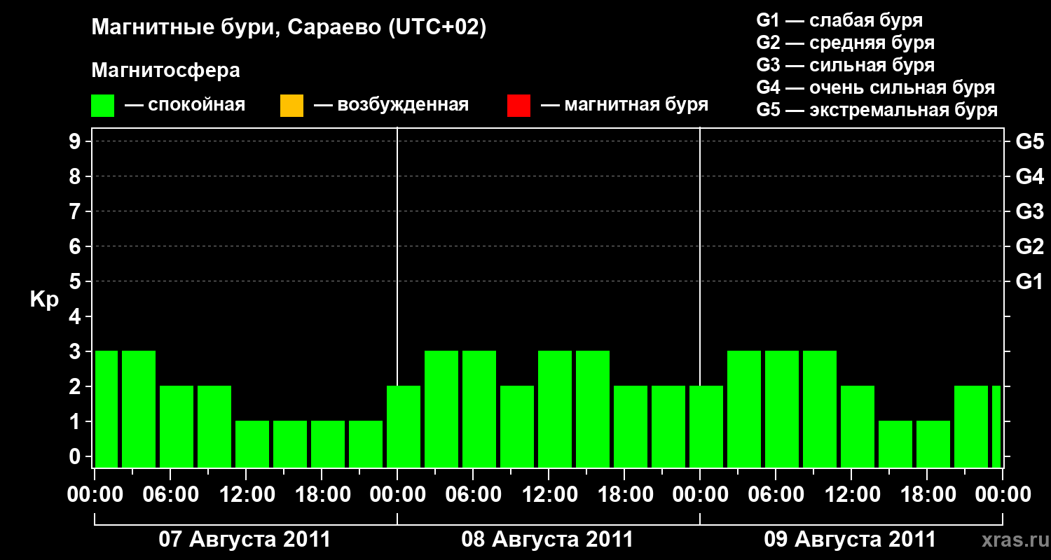 Изменения геомагнитного индекса Kp с 7 по 9 августа 2011 года для средних широт