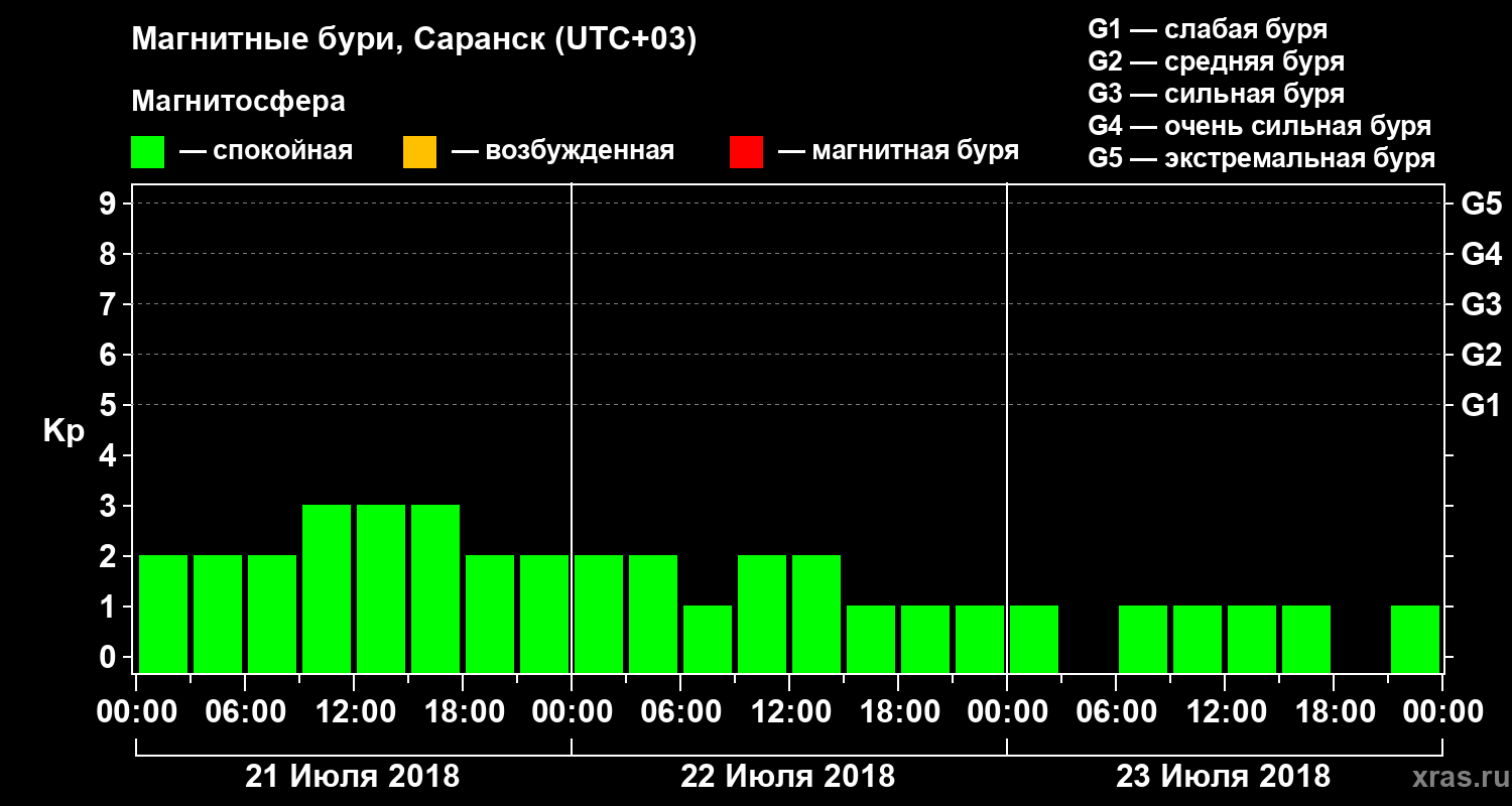 Изменения геомагнитного индекса Kp с 21 по 23 июля 2018 года для средних широт