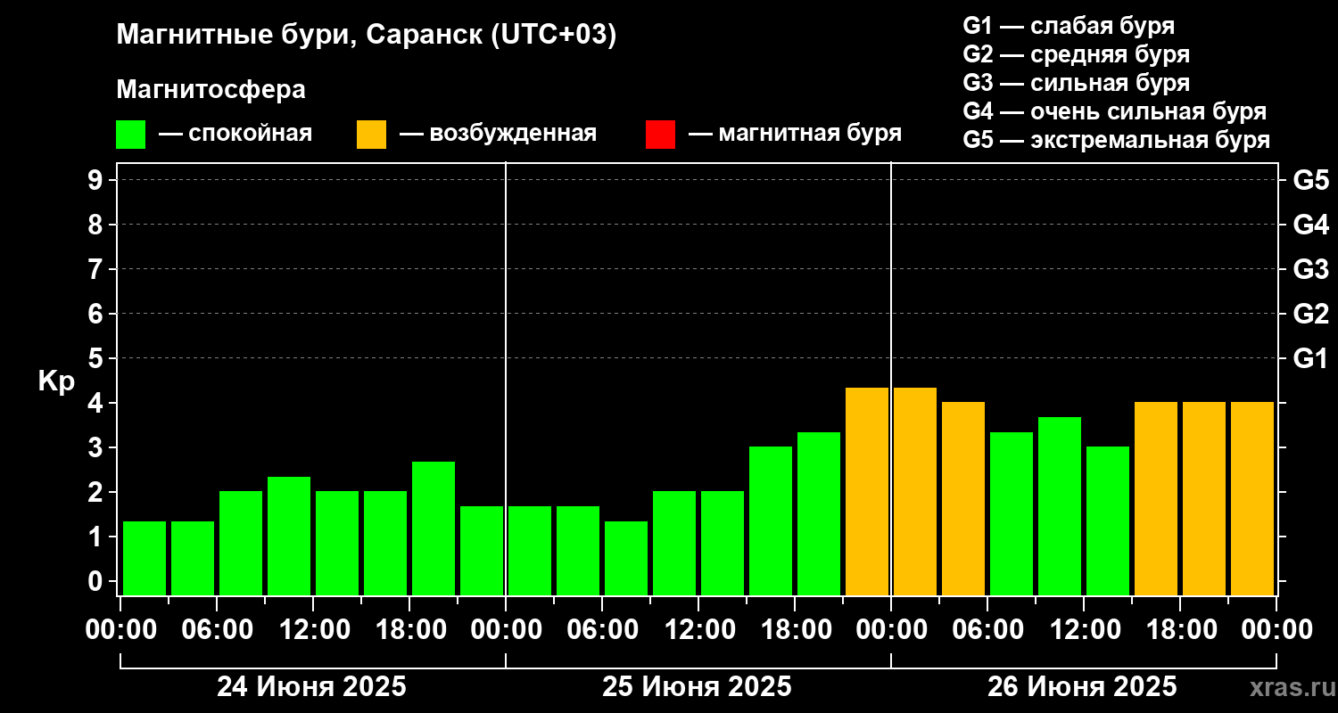 Изменения геомагнитного индекса Kp с 24 по 26 июня 2025 года для средних широт