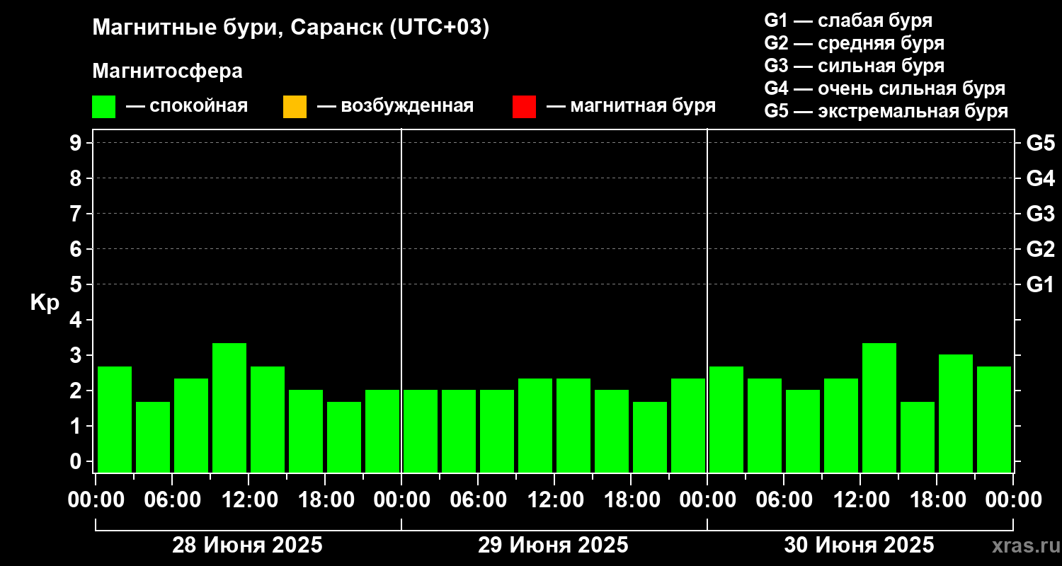 Изменения геомагнитного индекса Kp с 28 по 30 июня 2025 года для средних широт