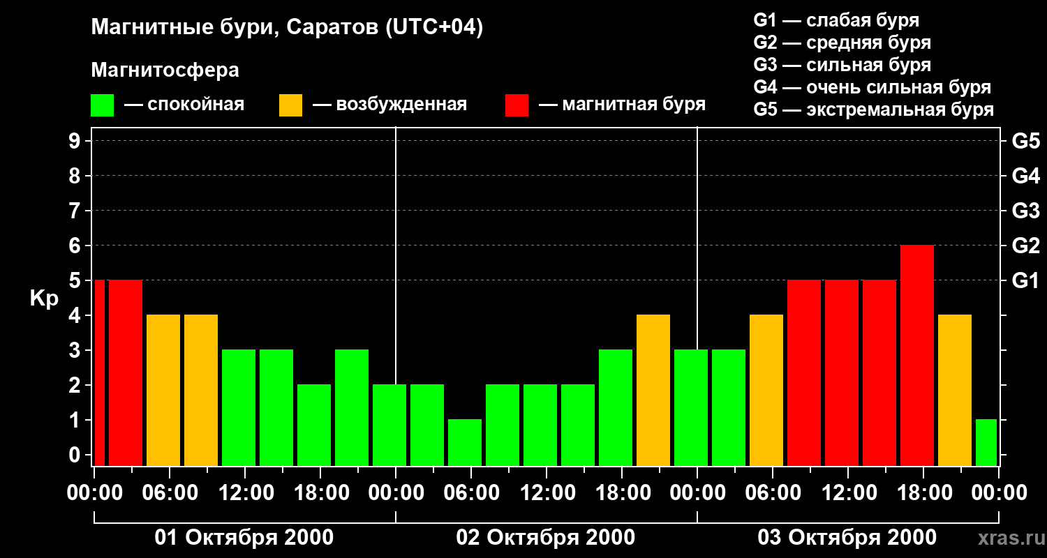 Изменения геомагнитного индекса Kp с 1 по 3 октября 2000 года для средних широт