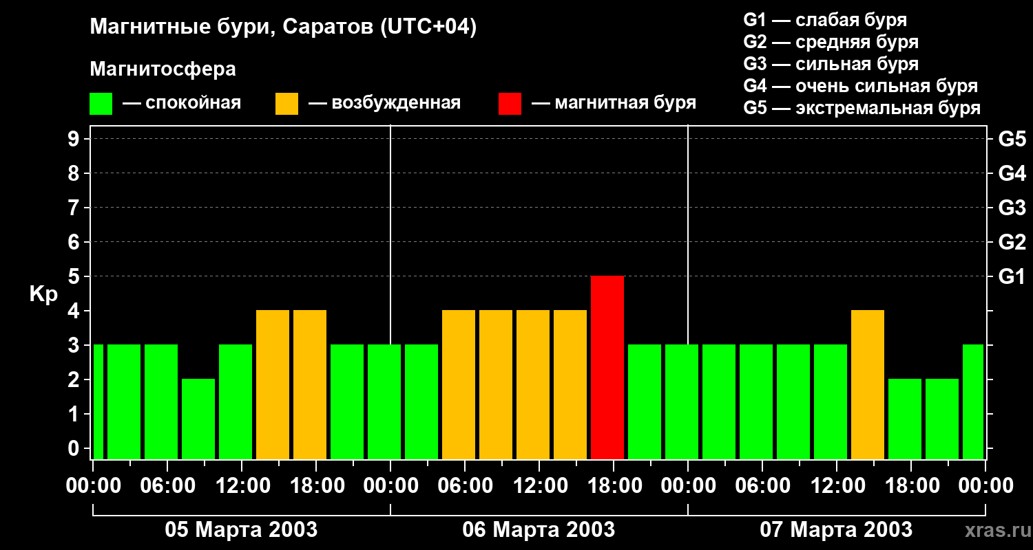 Изменения геомагнитного индекса Kp с 5 по 7 марта 2003 года для средних широт