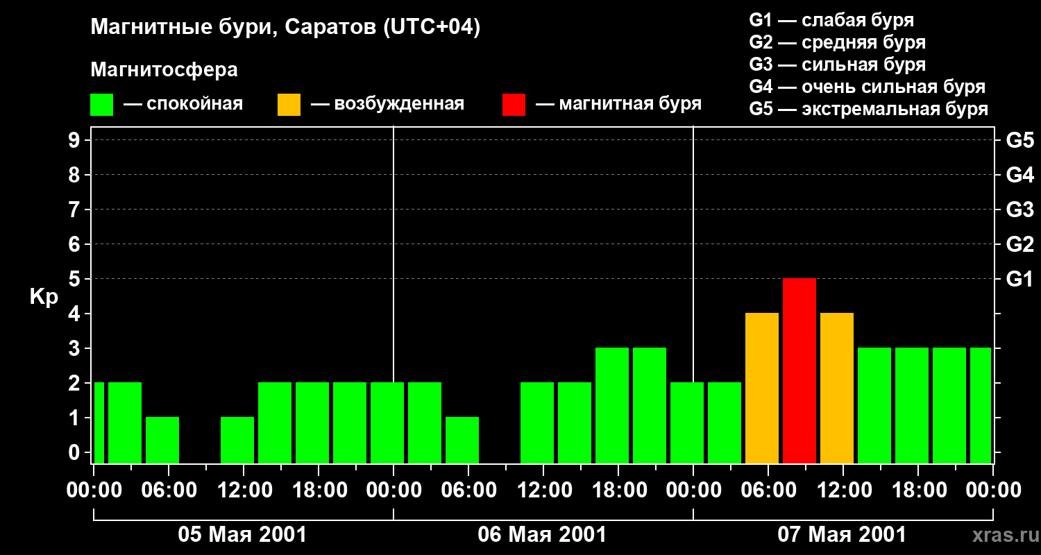 Изменения геомагнитного индекса Kp с 5 по 7 мая 2001 года для средних широт