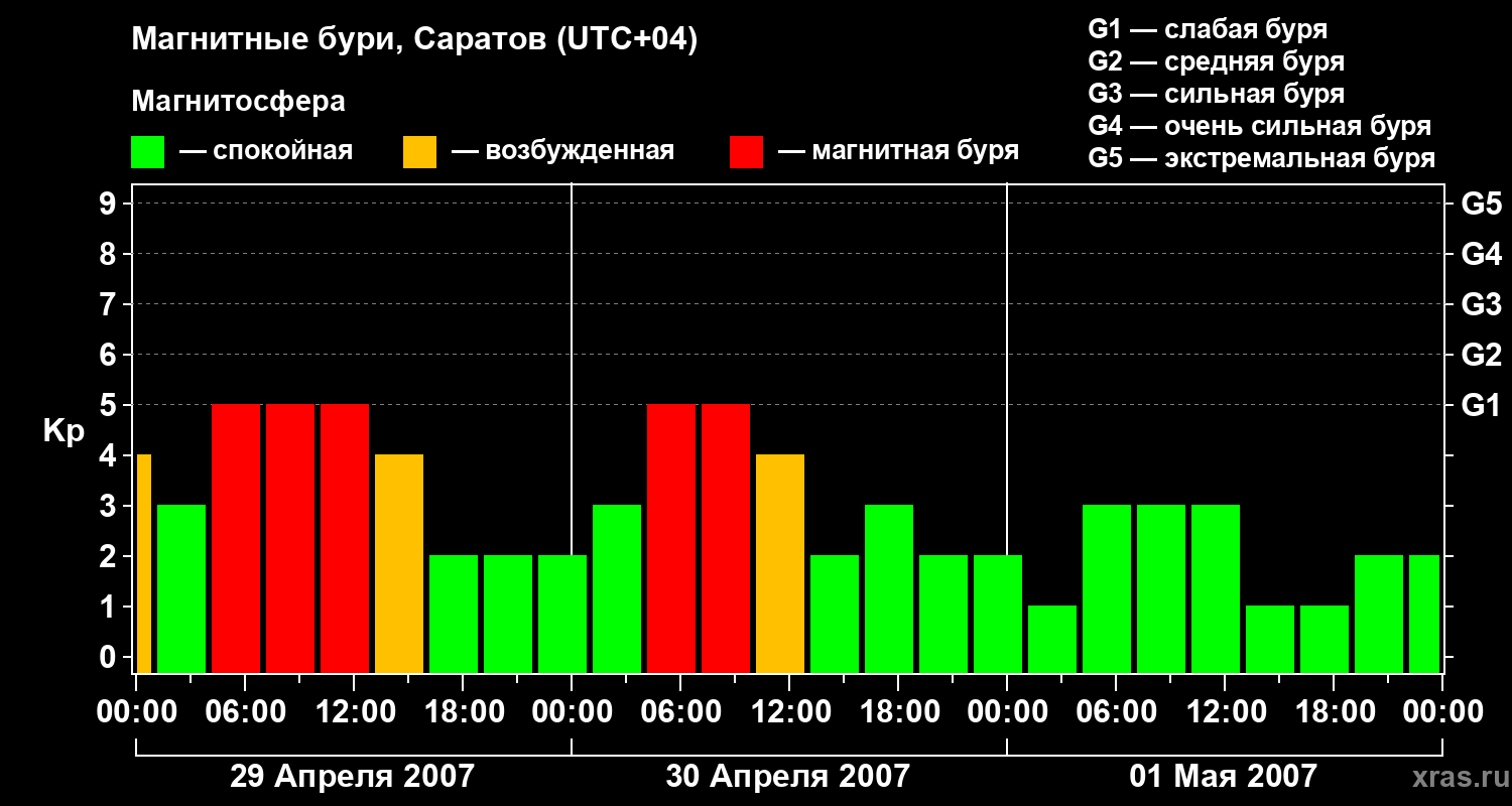 Изменения геомагнитного индекса Kp с 29 апреля по 1 мая 2007 года для средних широт
