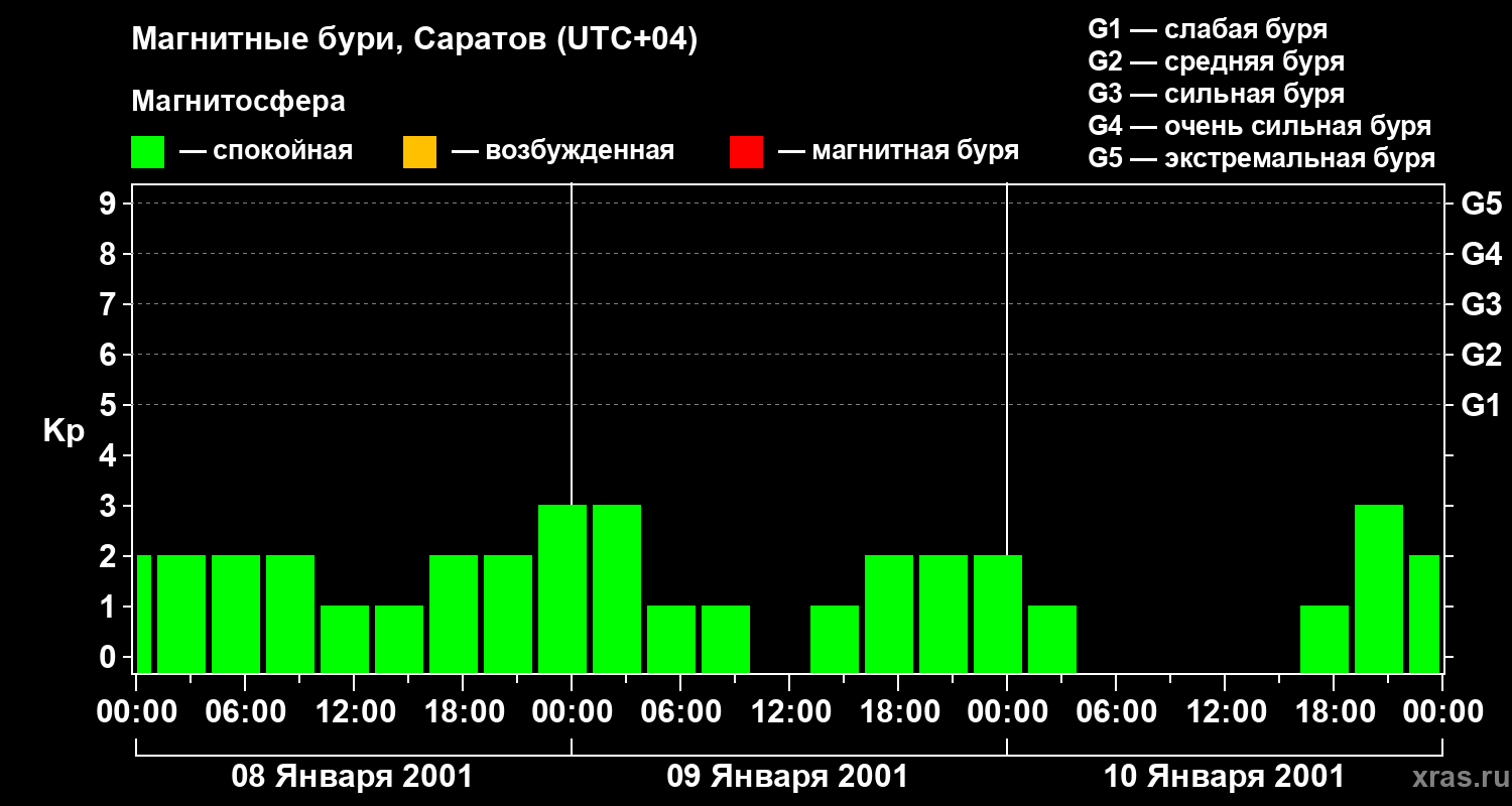 Изменения геомагнитного индекса Kp с 8 по 10 января 2001 года для средних широт