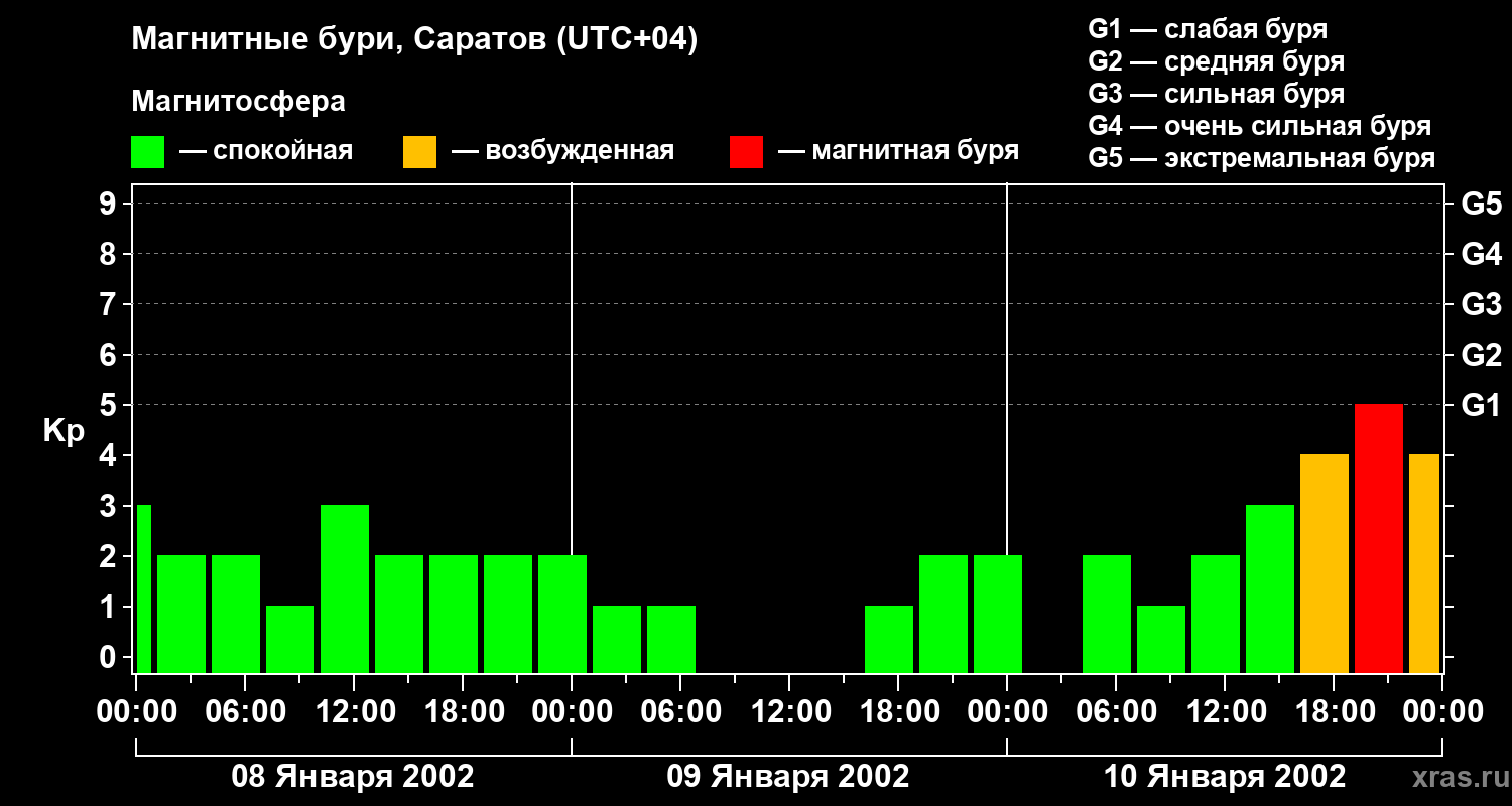 Изменения геомагнитного индекса Kp с 8 по 10 января 2002 года для средних широт