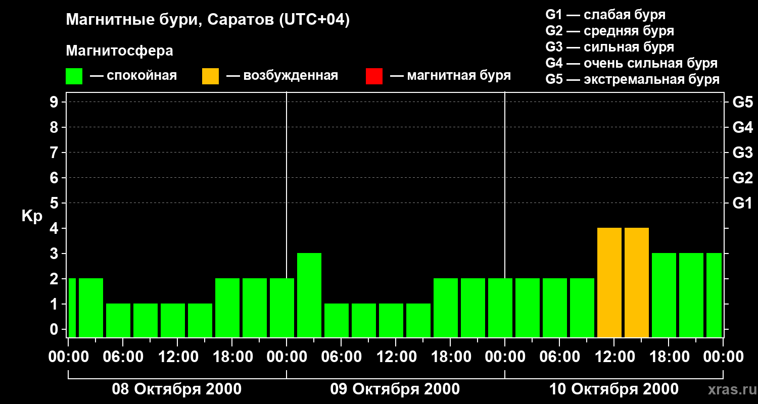 Изменения геомагнитного индекса Kp с 8 по 10 октября 2000 года для средних широт