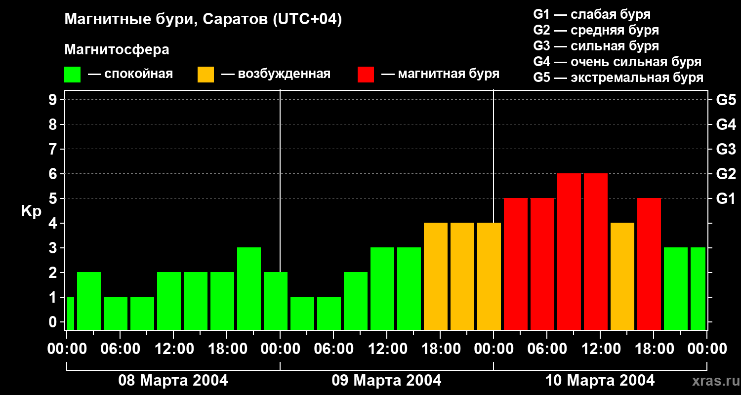 Изменения геомагнитного индекса Kp с 8 по 10 марта 2004 года для средних широт