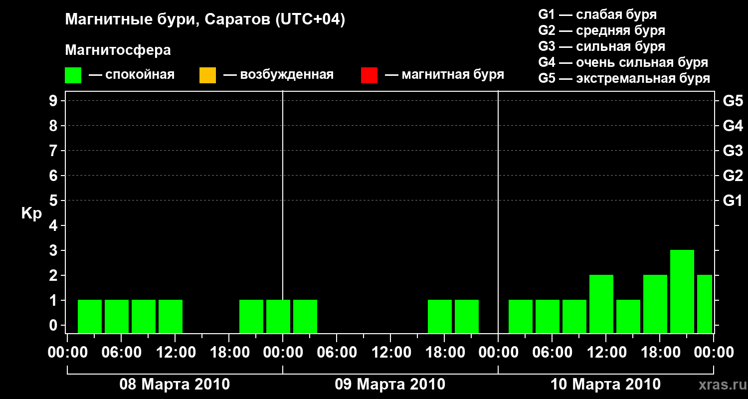 Изменения геомагнитного индекса Kp с 8 по 10 марта 2010 года для средних широт