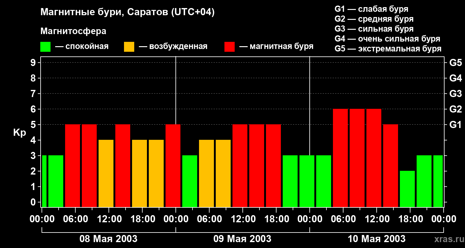 Изменения геомагнитного индекса Kp с 8 по 10 мая 2003 года для средних широт