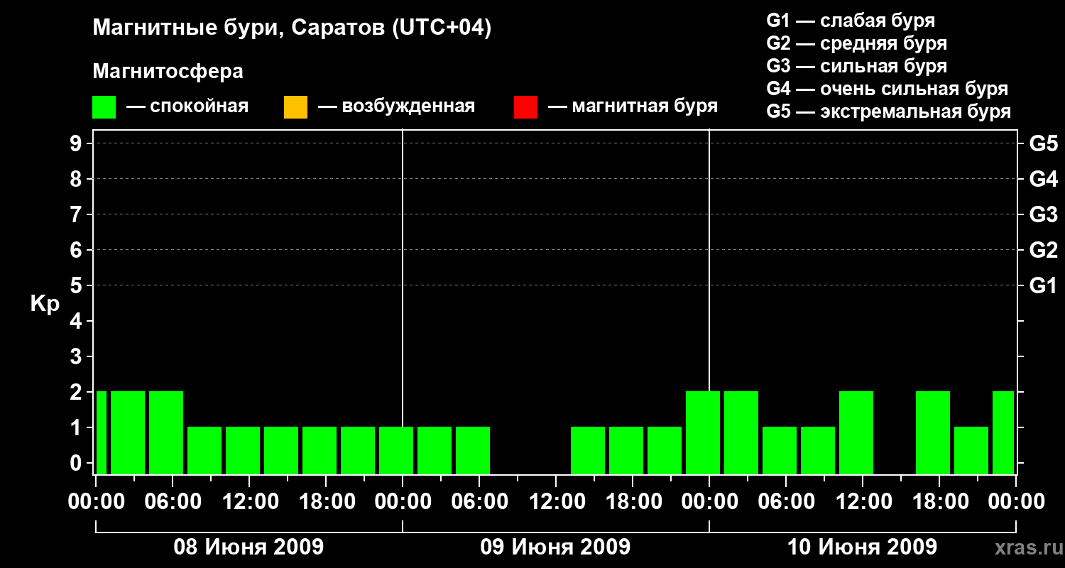 Изменения геомагнитного индекса Kp с 8 по 10 июня 2009 года для средних широт