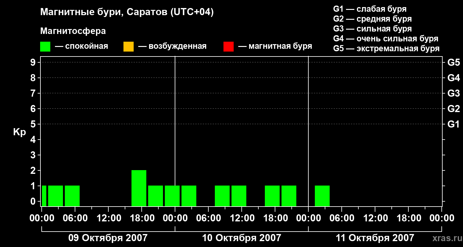 Изменения геомагнитного индекса Kp с 9 по 11 октября 2007 года для средних широт