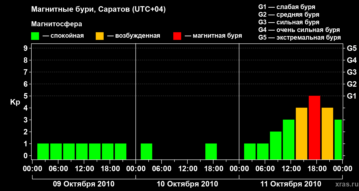 Изменения геомагнитного индекса Kp с 9 по 11 октября 2010 года для средних широт