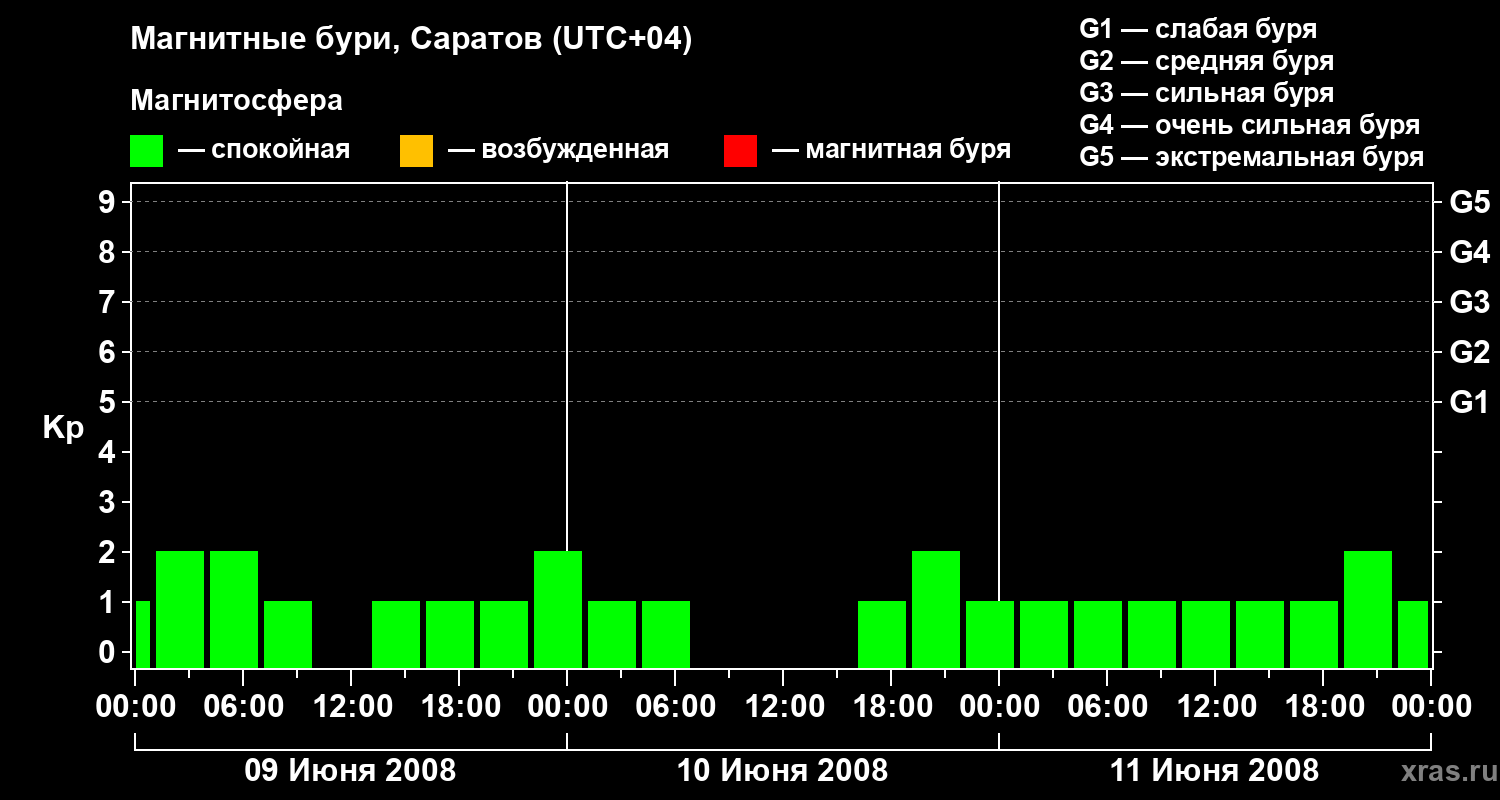 Изменения геомагнитного индекса Kp с 9 по 11 июня 2008 года для средних широт