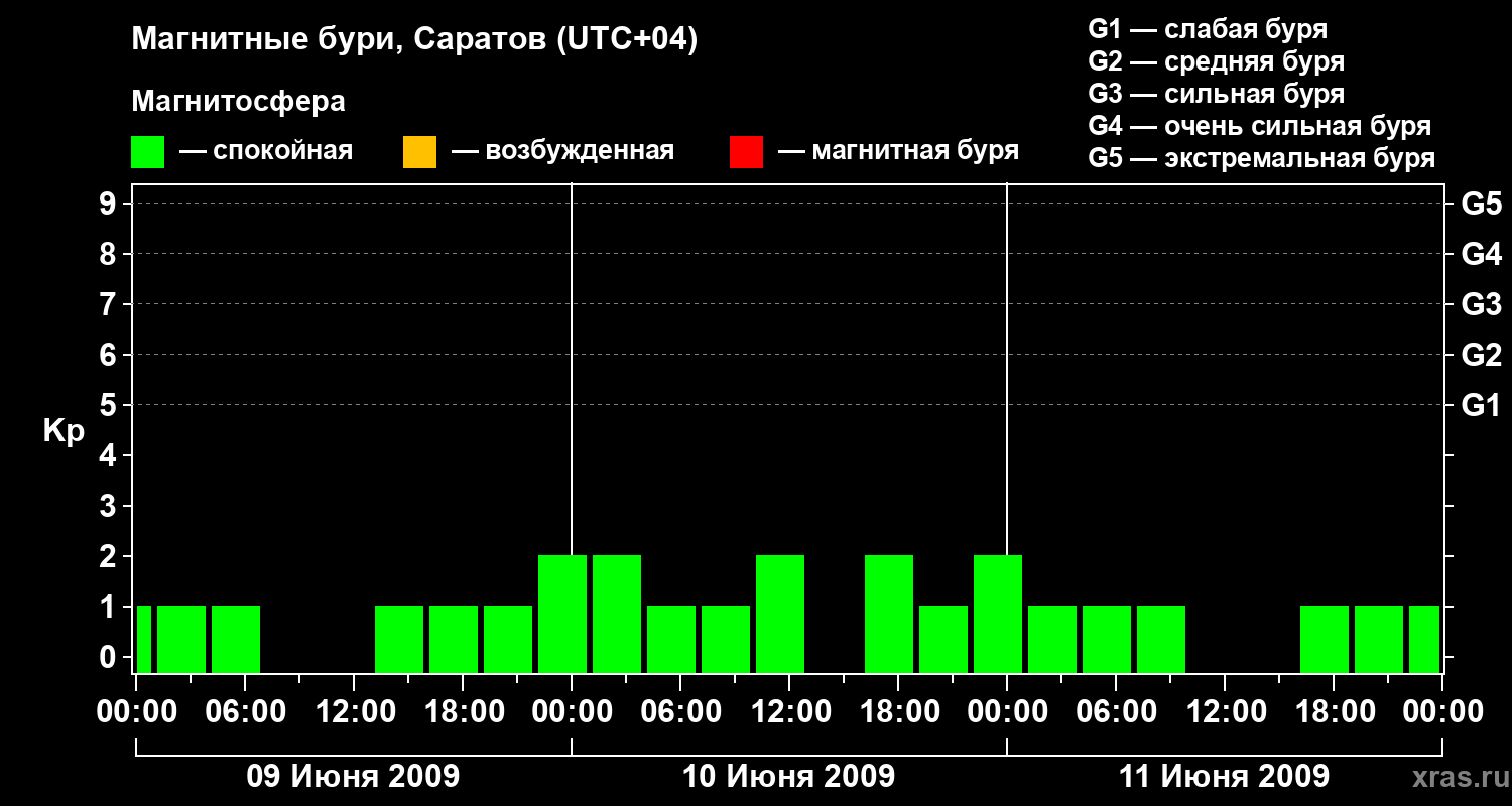 Изменения геомагнитного индекса Kp с 9 по 11 июня 2009 года для средних широт