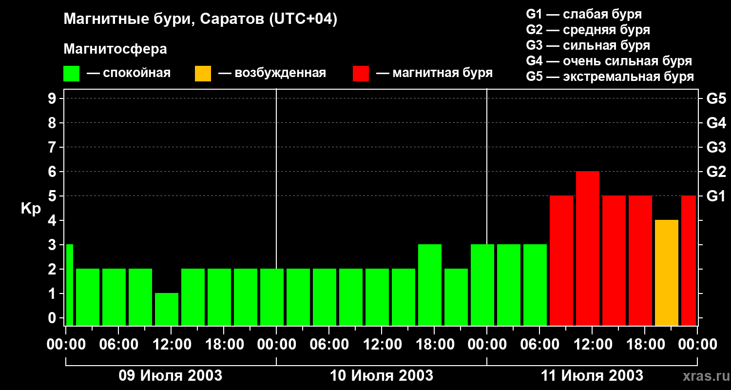 Изменения геомагнитного индекса Kp с 9 по 11 июля 2003 года для средних широт