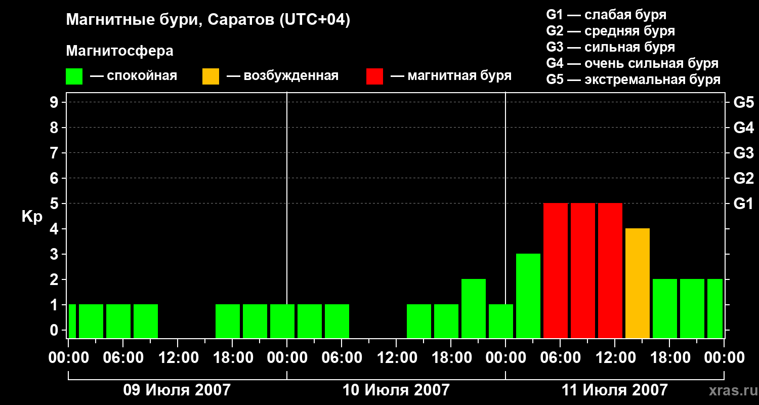 Изменения геомагнитного индекса Kp с 9 по 11 июля 2007 года для средних широт