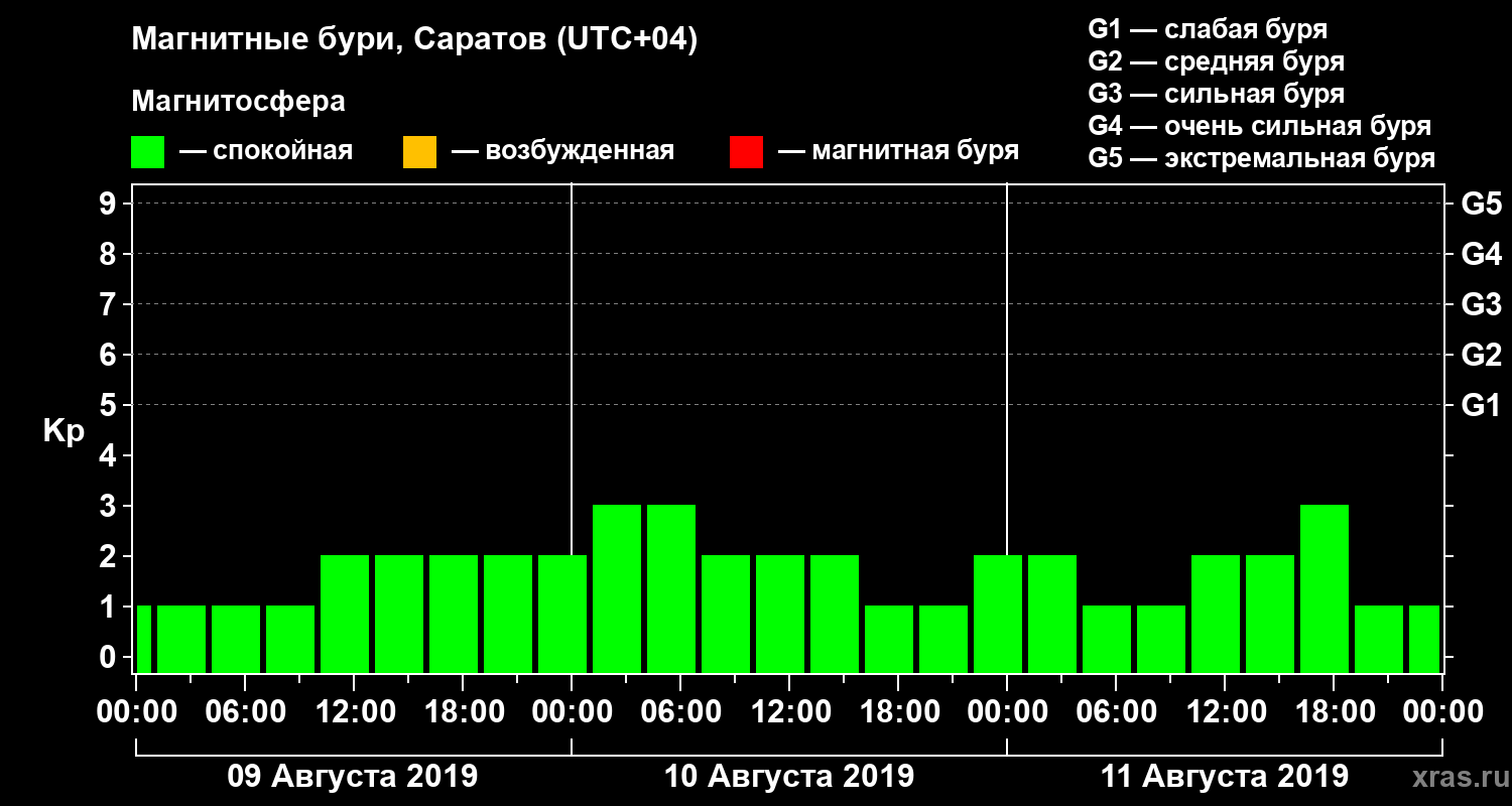 Изменения геомагнитного индекса Kp с 9 по 11 августа 2019 года для средних широт