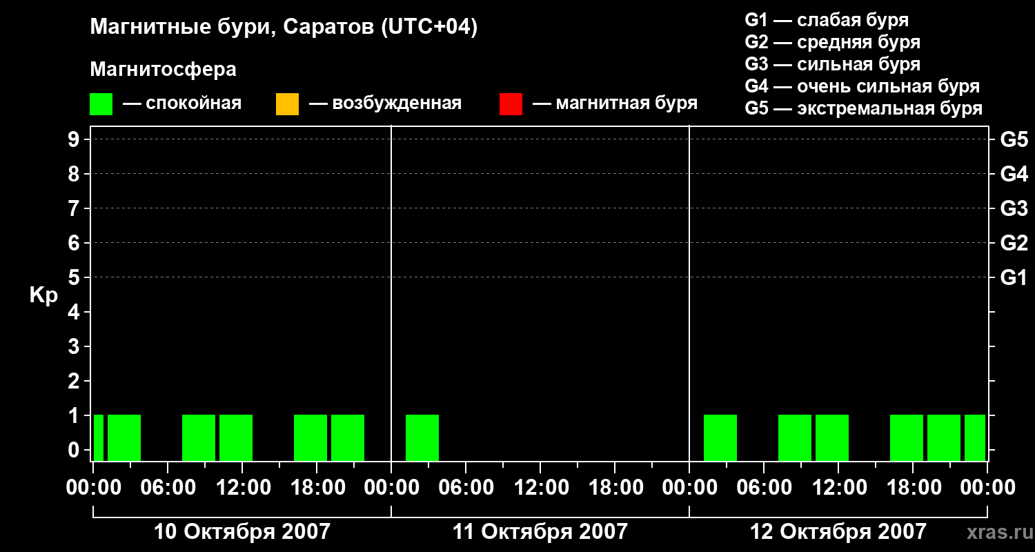 Изменения геомагнитного индекса Kp с 10 по 12 октября 2007 года для средних широт