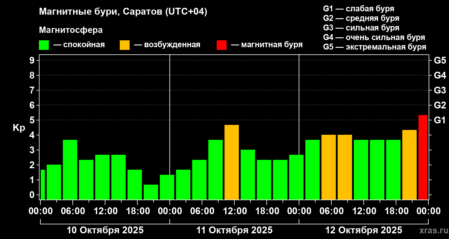 Изменения геомагнитного индекса Kp с 10 по 12 октября 2025 года для средних широт