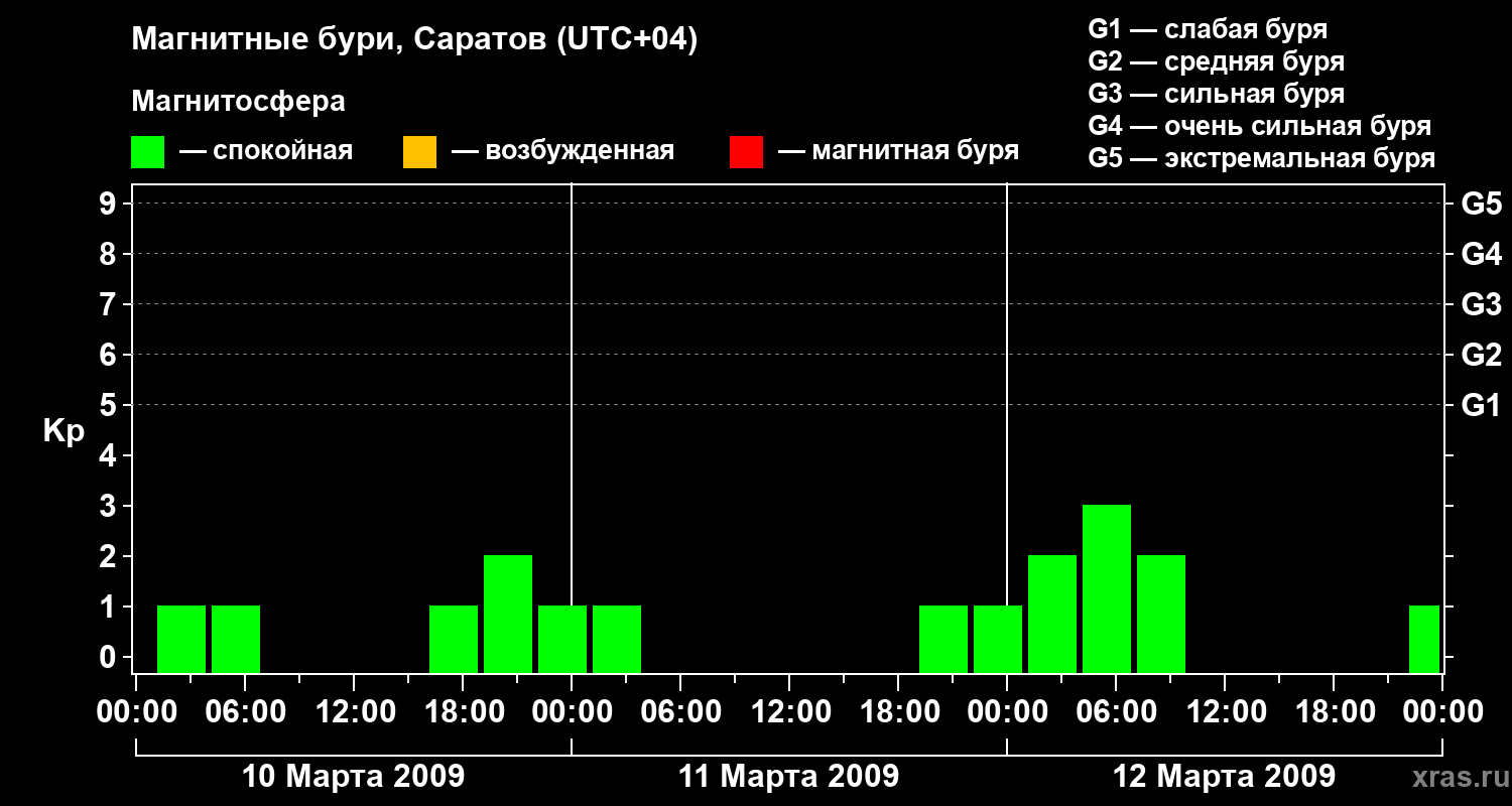 Изменения геомагнитного индекса Kp с 10 по 12 марта 2009 года для средних широт