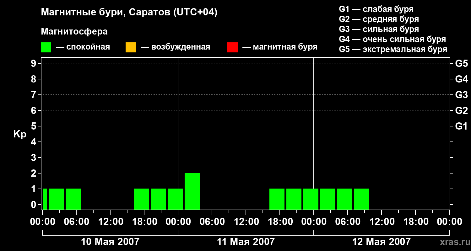 Изменения геомагнитного индекса Kp с 10 по 12 мая 2007 года для средних широт