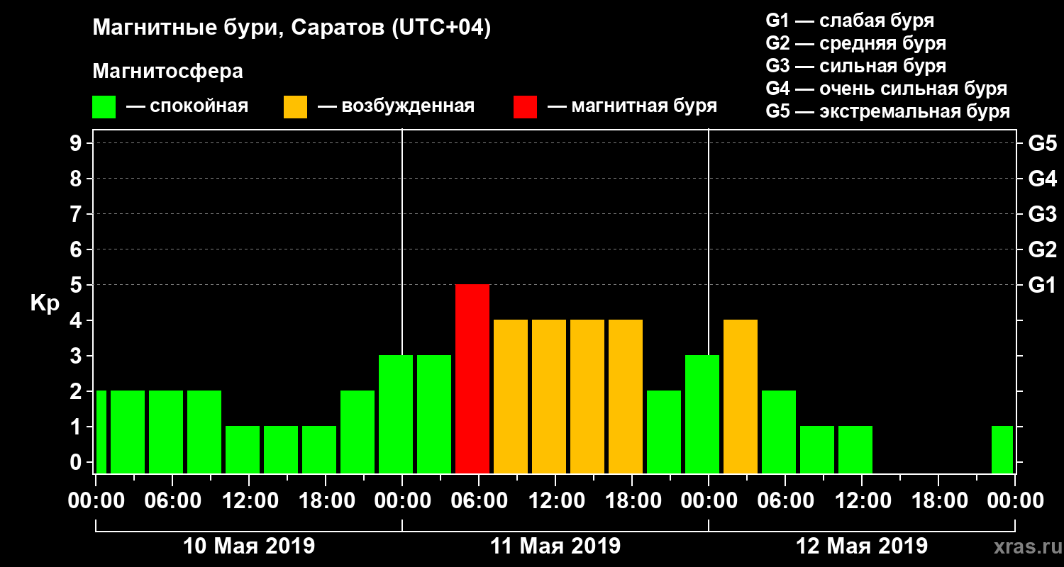 Изменения геомагнитного индекса Kp с 10 по 12 мая 2019 года для средних широт