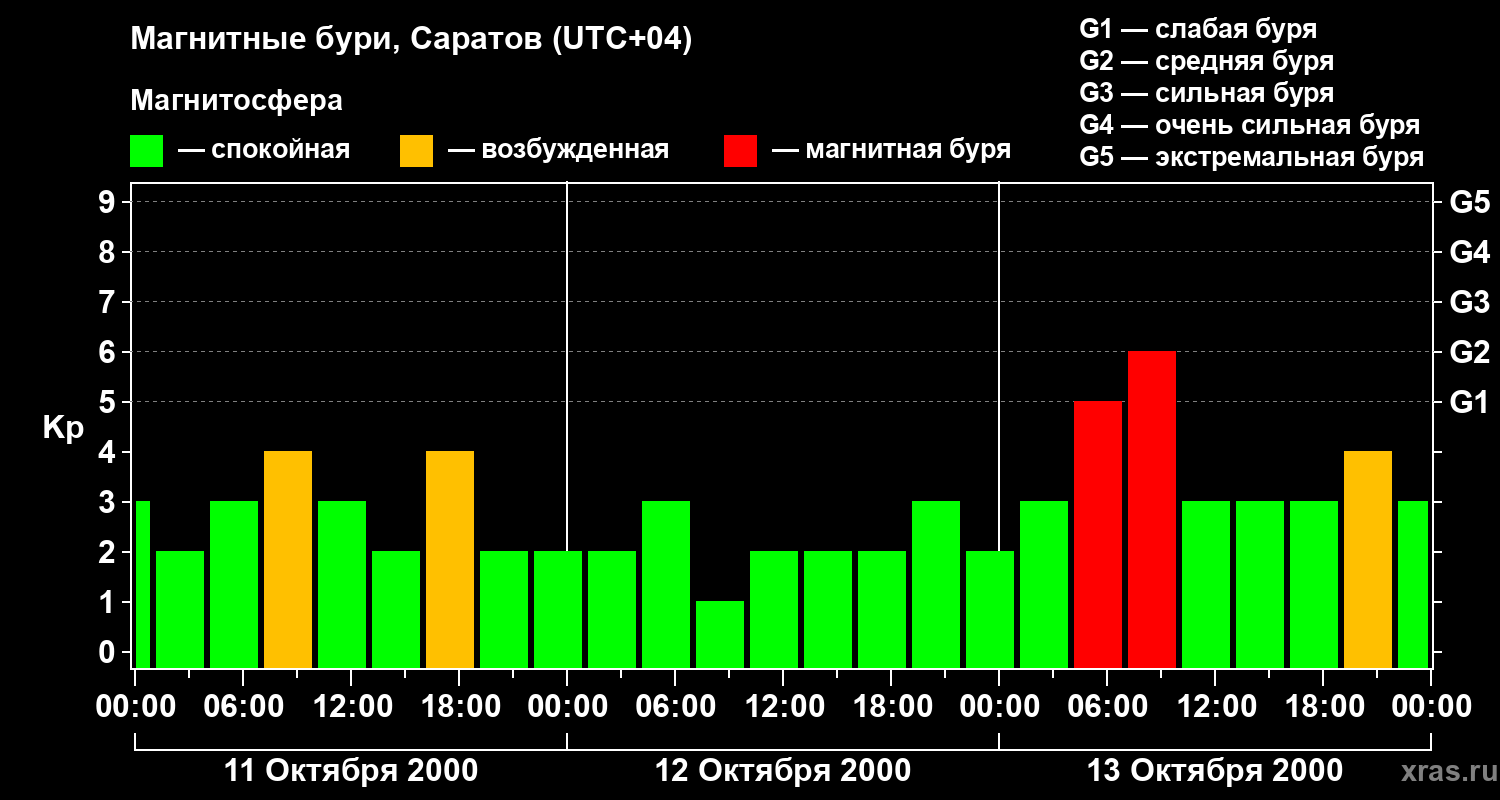 Изменения геомагнитного индекса Kp с 11 по 13 октября 2000 года для средних широт