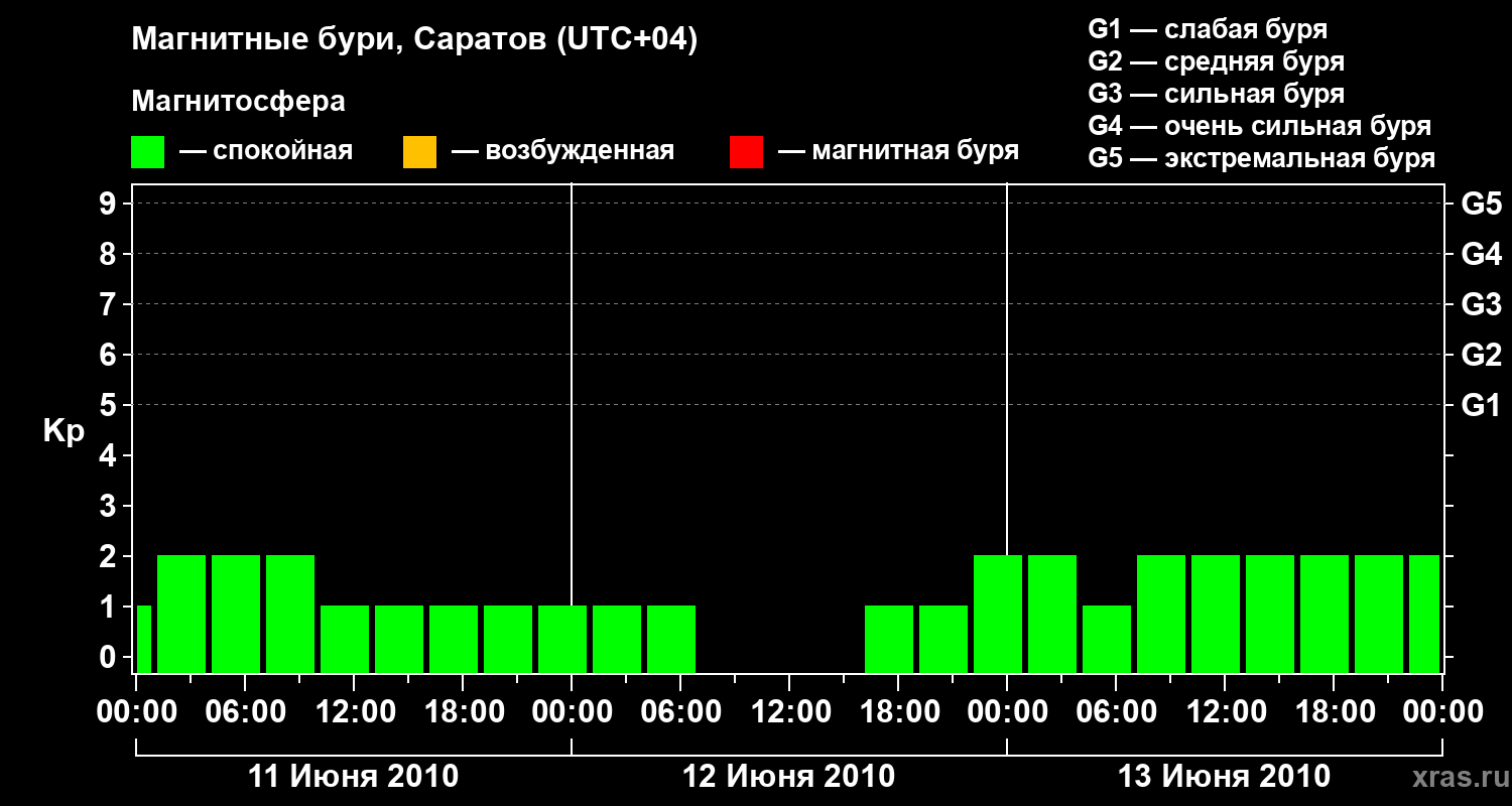 Изменения геомагнитного индекса Kp с 11 по 13 июня 2010 года для средних широт