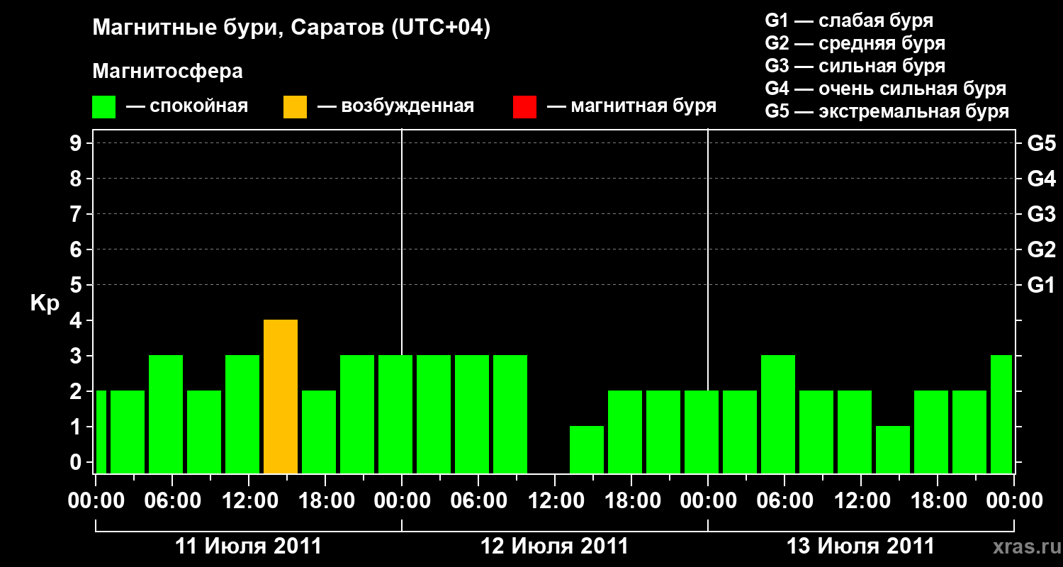 Изменения геомагнитного индекса Kp с 11 по 13 июля 2011 года для средних широт