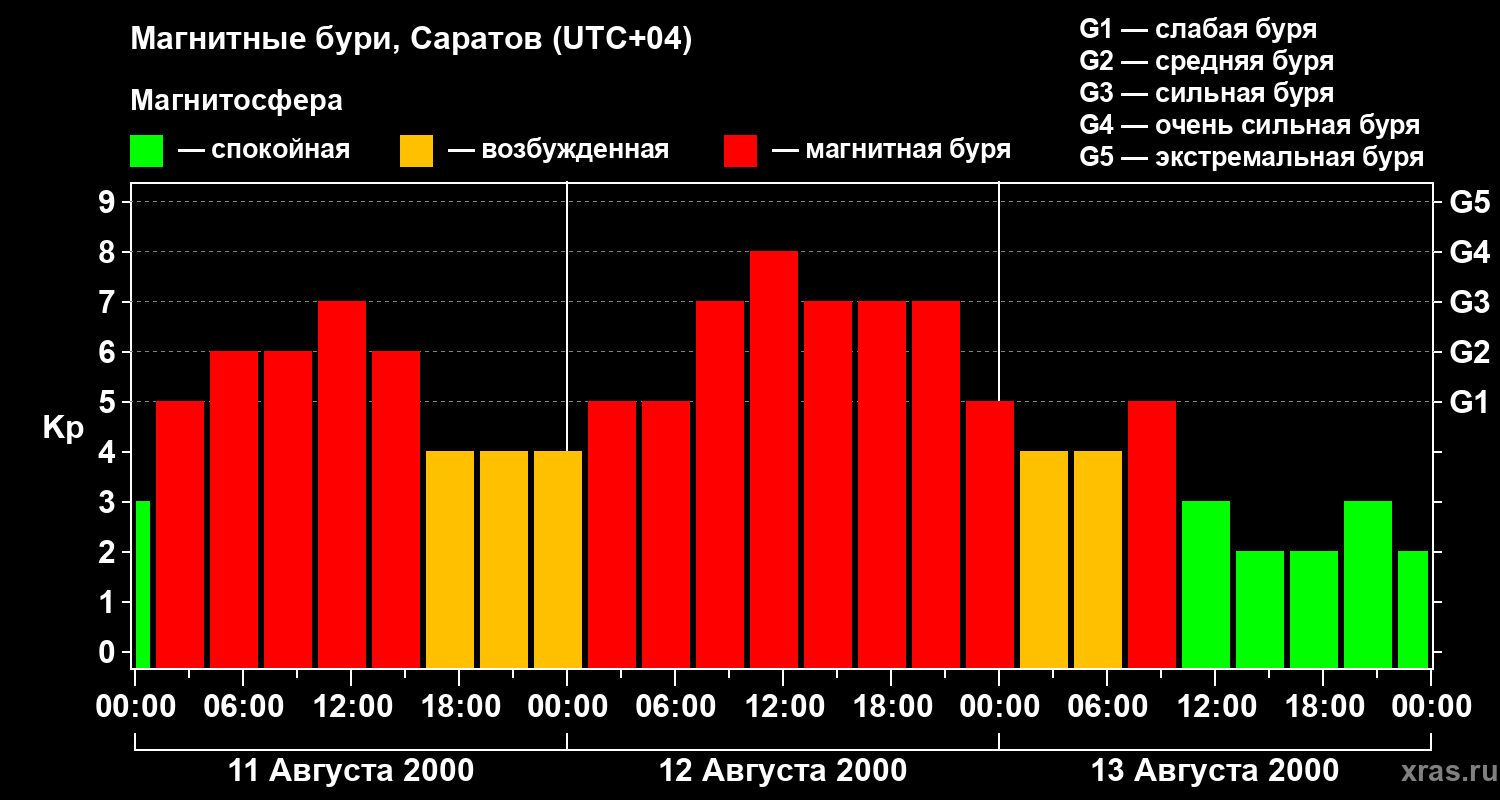 Изменения геомагнитного индекса Kp с 11 по 13 августа 2000 года для средних широт