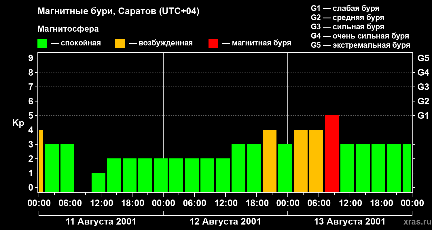 Изменения геомагнитного индекса Kp с 11 по 13 августа 2001 года для средних широт