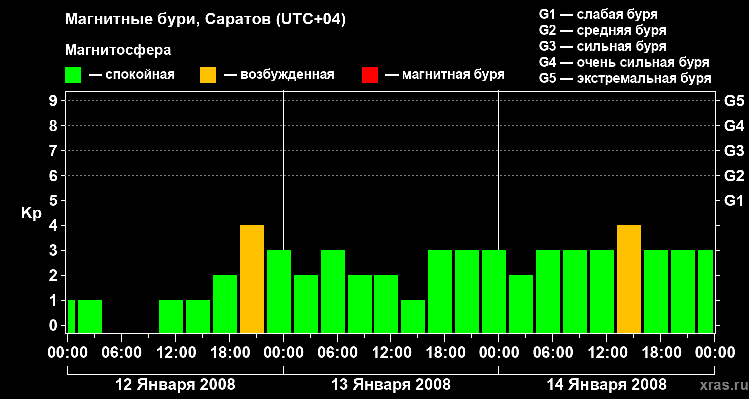 Изменения геомагнитного индекса Kp с 12 по 14 января 2008 года для средних широт