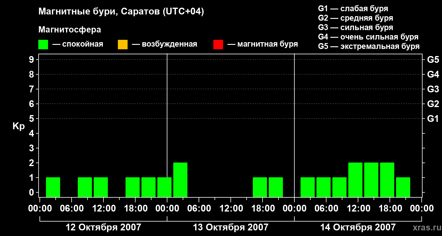 Изменения геомагнитного индекса Kp с 12 по 14 октября 2007 года для средних широт