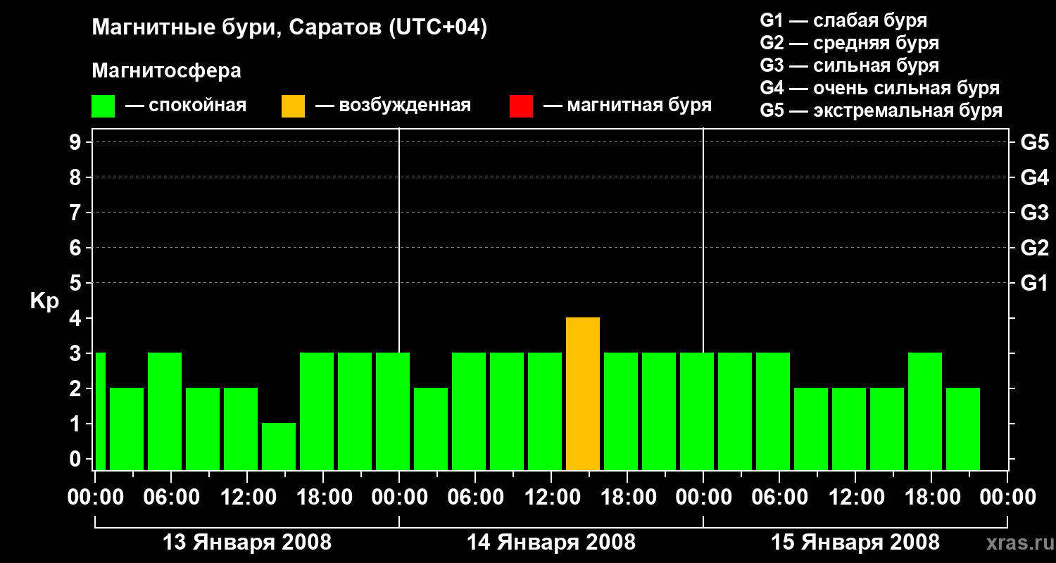 Изменения геомагнитного индекса Kp с 13 по 15 января 2008 года для средних широт