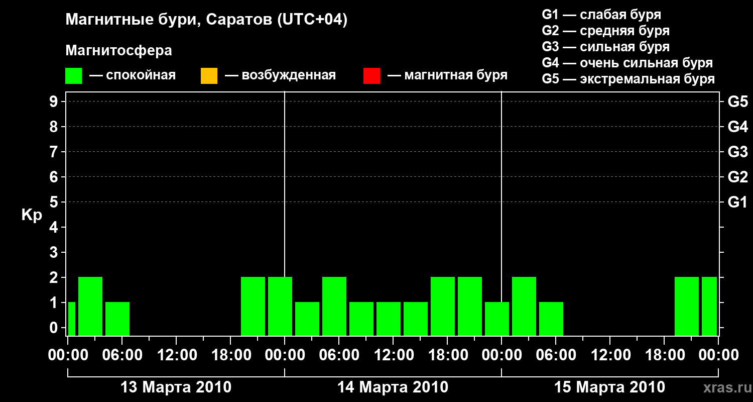 Изменения геомагнитного индекса Kp с 13 по 15 марта 2010 года для средних широт