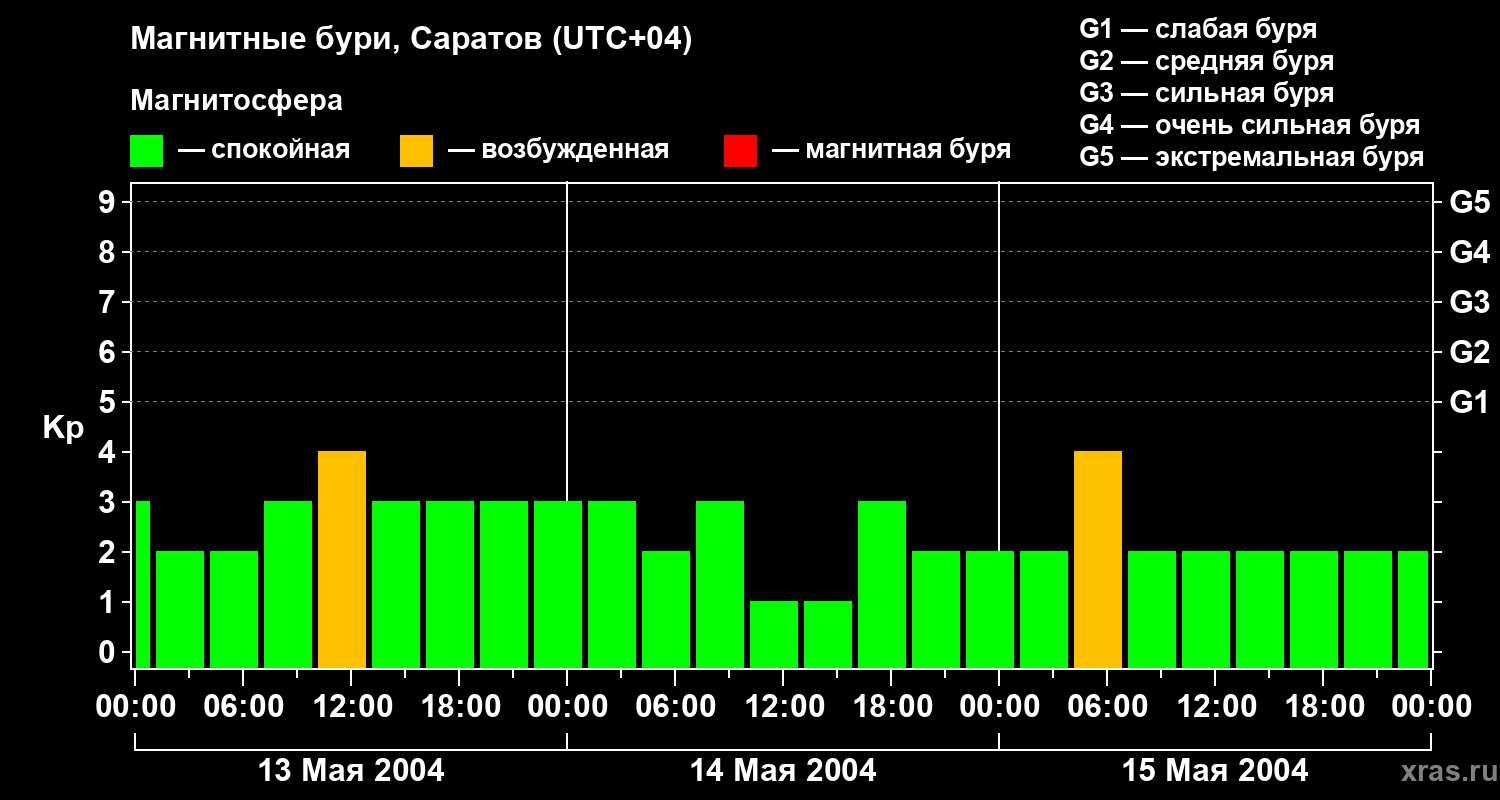 Изменения геомагнитного индекса Kp с 13 по 15 мая 2004 года для средних широт