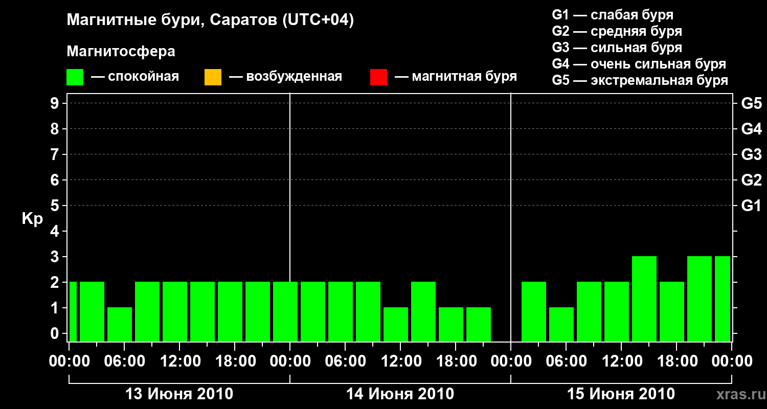 Изменения геомагнитного индекса Kp с 13 по 15 июня 2010 года для средних широт
