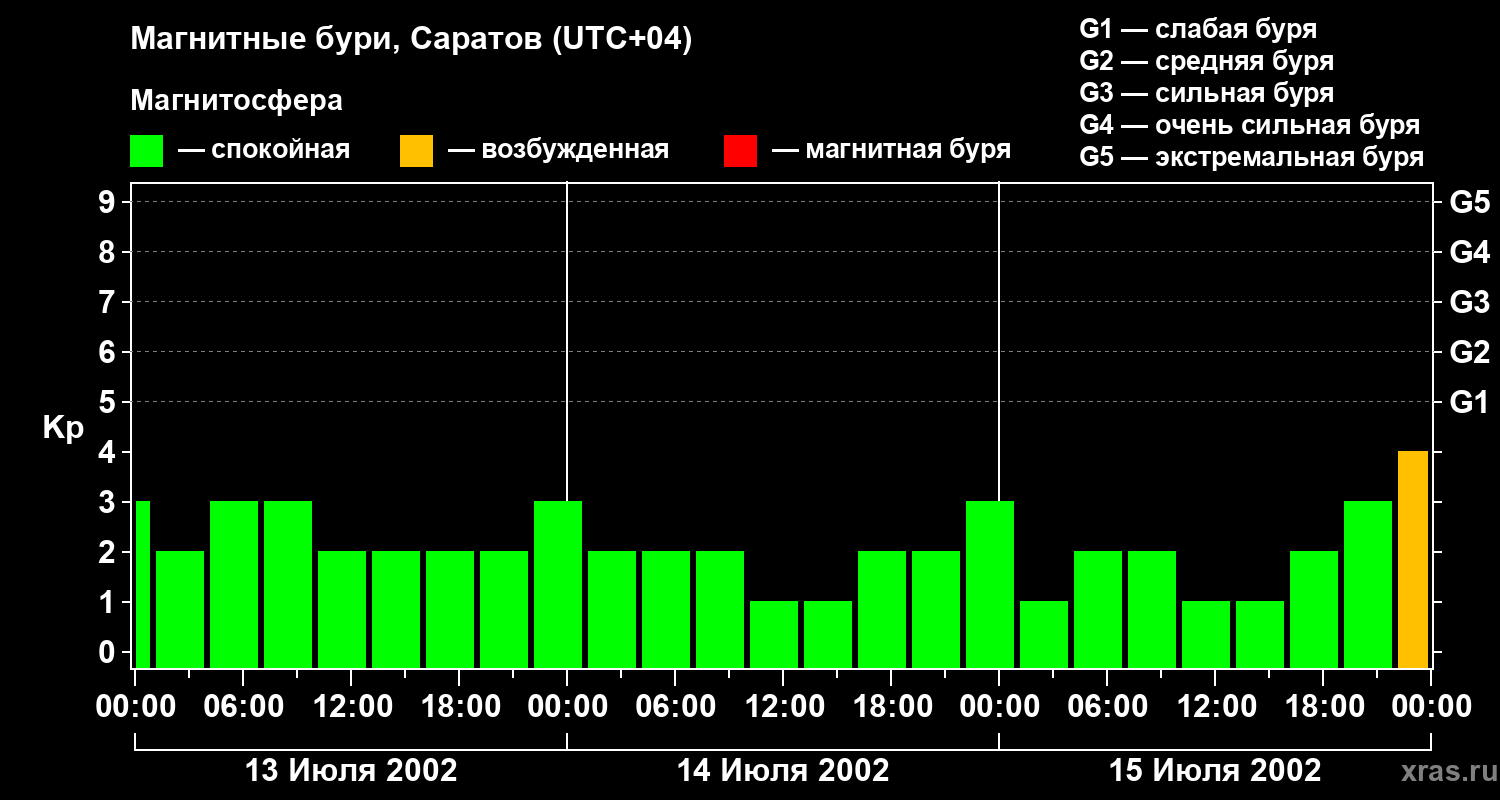 Изменения геомагнитного индекса Kp с 13 по 15 июля 2002 года для средних широт