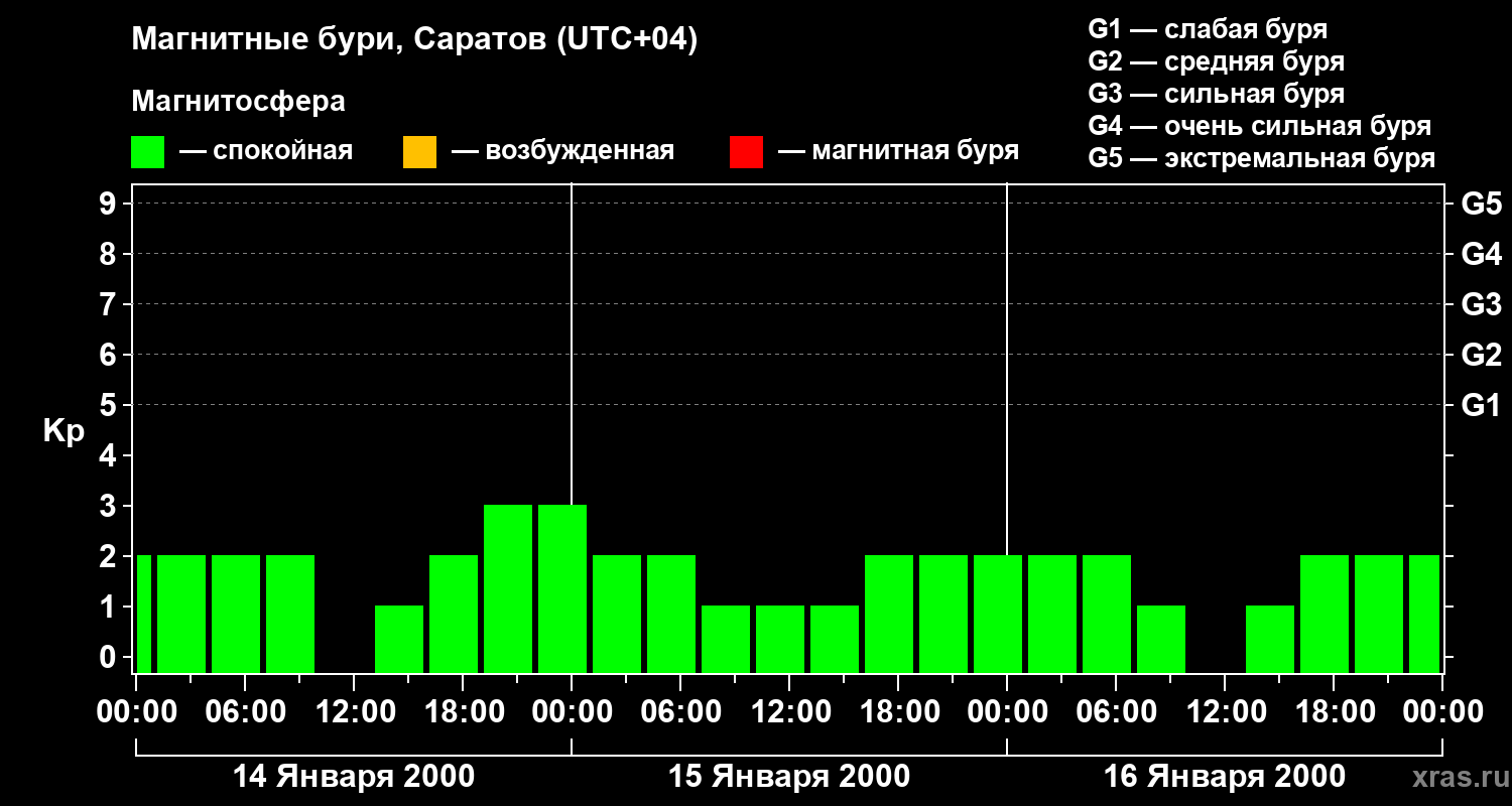 Изменения геомагнитного индекса Kp с 14 по 16 января 2000 года для средних широт