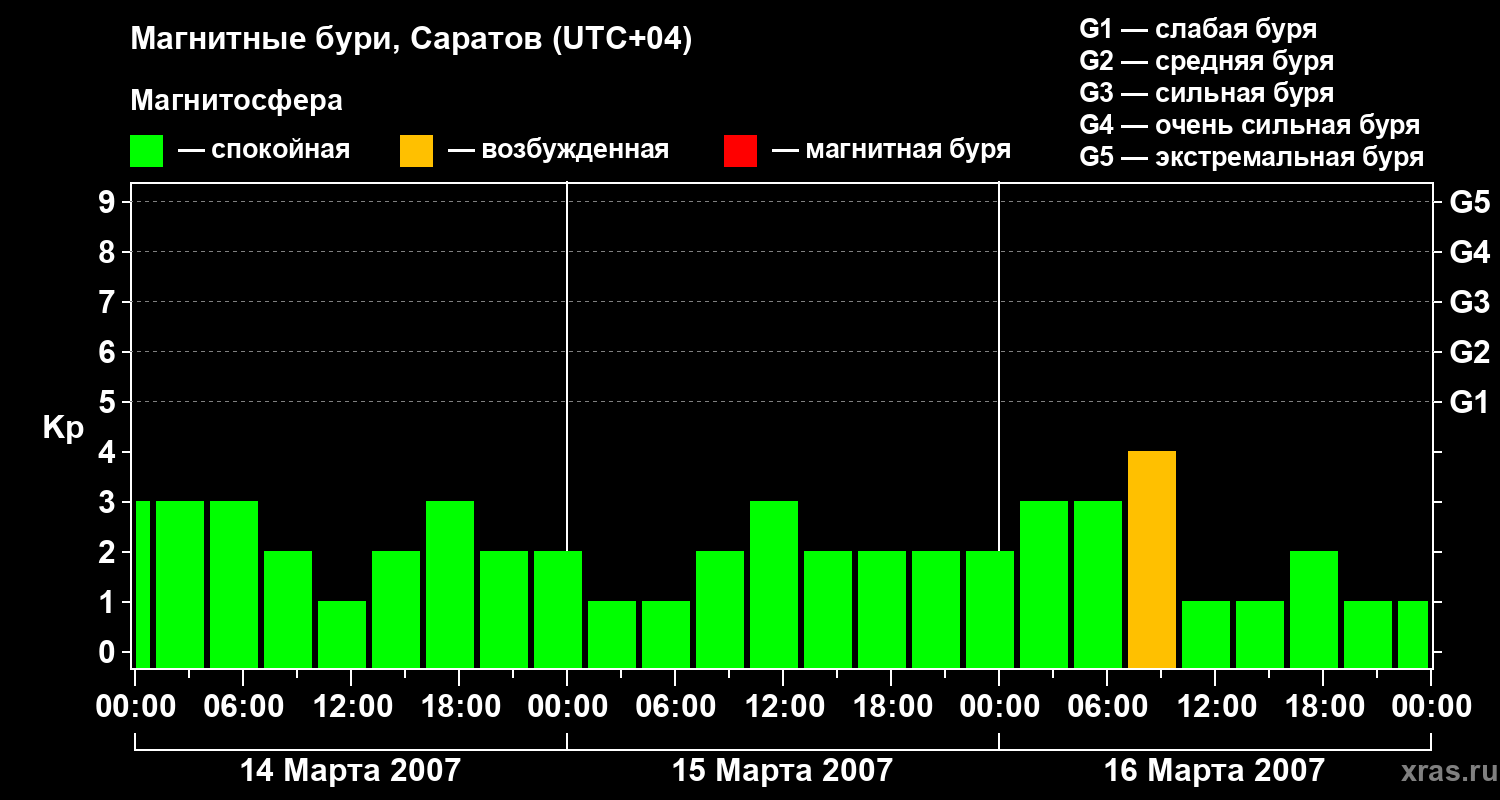 Изменения геомагнитного индекса Kp с 14 по 16 марта 2007 года для средних широт