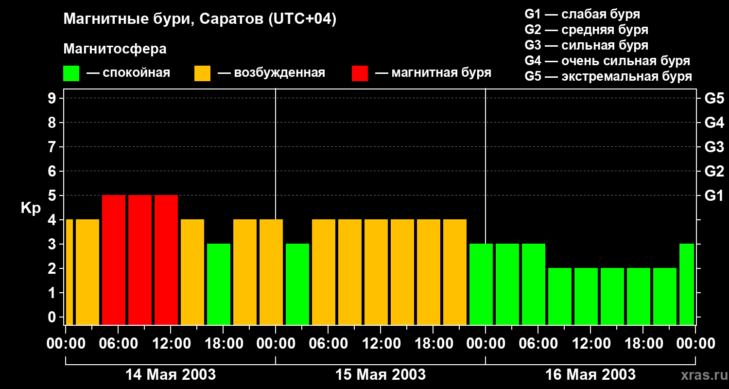 Изменения геомагнитного индекса Kp с 14 по 16 мая 2003 года для средних широт